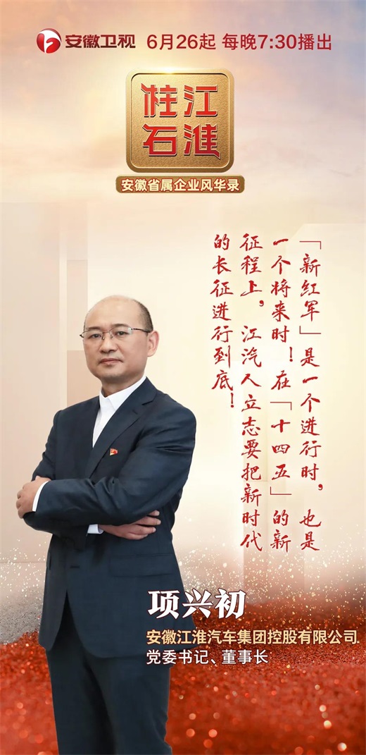 6月28日,在安徽省國資委、安徽衛視聯合安徽省屬29家企業推出的29集微紀錄片《江淮柱石》節目中,江汽集團黨委書記、董事長項興初帶來了一本《JAC憲章》,深情講述其中蘊含的“新紅軍精神”,激情展現“十四五”的新征程上,江汽人立志要把新時代的長征進行到底的豪情!