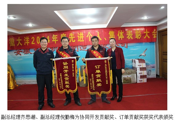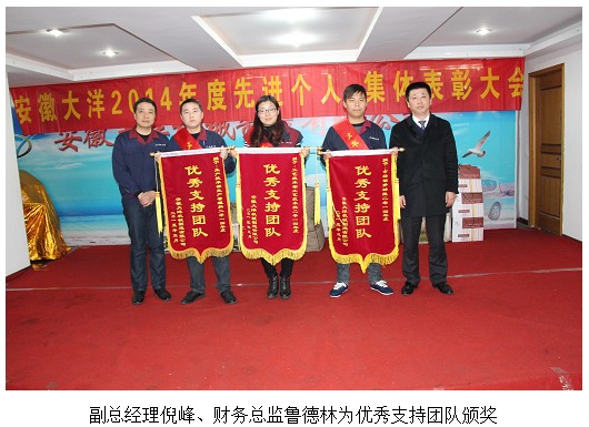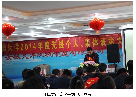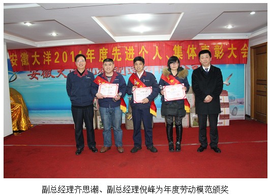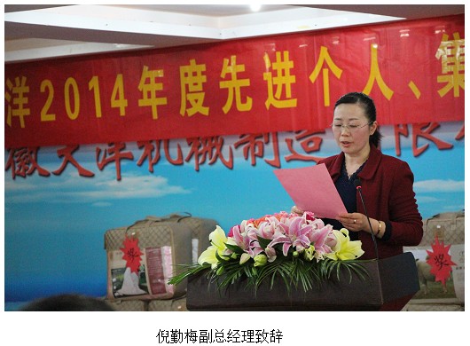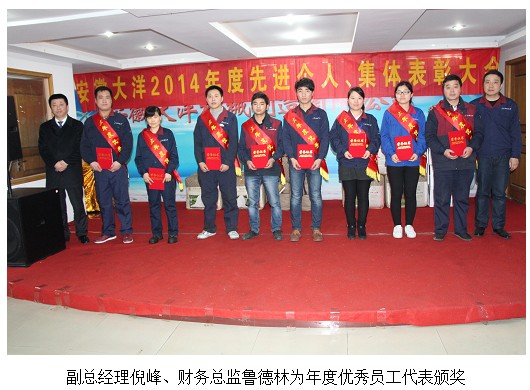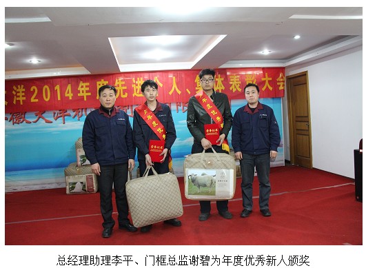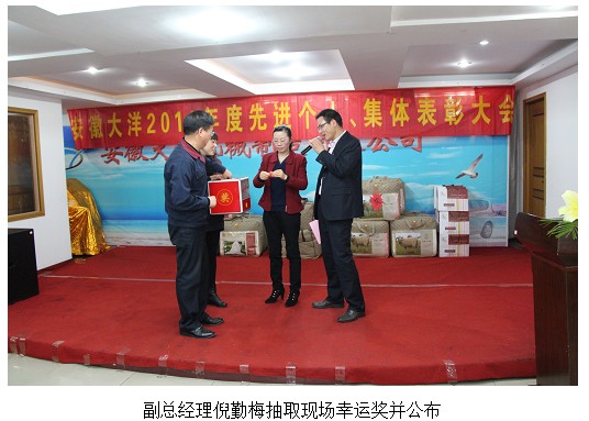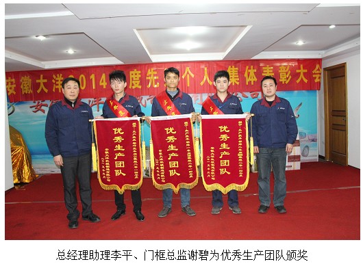 2015年3月21日下午14時(shí)58分安徽大洋2014年度先進(jìn)個(gè)人、集體表彰大會(huì)在二樓多功能會(huì)議室舉行,公司領(lǐng)導(dǎo):副總經(jīng)理齊思潮先生、副總經(jīng)理倪勤梅女士、副總經(jīng)理倪峰先生、總經(jīng)理助理李平先生、財(cái)務(wù)總監(jiān)魯?shù)铝窒壬㈤T框總監(jiān)謝碧先生參加表彰大會(huì)并為大會(huì)獲獎(jiǎng)的先進(jìn)個(gè)人、集體頒獎(jiǎng),同時(shí)也抽出現(xiàn)場(chǎng)幸運(yùn)獎(jiǎng)!