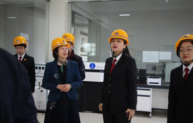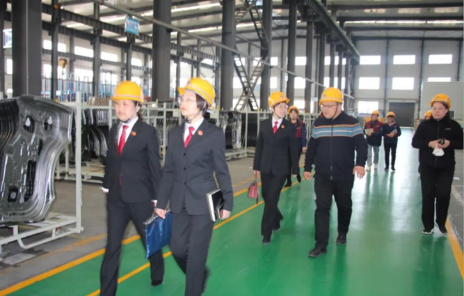 肥西縣人民法院領導一行人先后來到實驗室、沖壓車間、焊裝車間機器人自動化區域進行實地參觀考察。執行總經理倪勤梅對我司的生產模式、運行管理、技術改革等情況進行了全方位的介紹和講解。